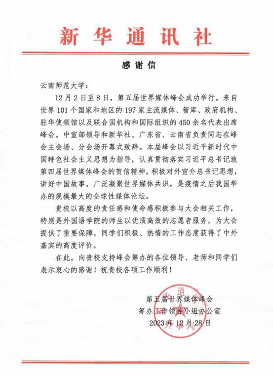 近日,新华通讯社向公司发来感谢信,对公司师生积极参与第五届世界媒体峰会相关工作表示感谢。感谢信指出,12月2日至8日,第五届世界媒体峰会成功举行。来自世界101个国家和地区的197家主流媒体、智库、政府机构、驻华使领馆以及联合国机构和国际组织的450余名代表出席峰会。本届峰会以习近平新时代中国特色社会主义思想为指导,广泛凝聚世界媒体共识,是疫情之后我国举办的规模最大的全球性媒体论坛。感谢信中表示,公司以高度...