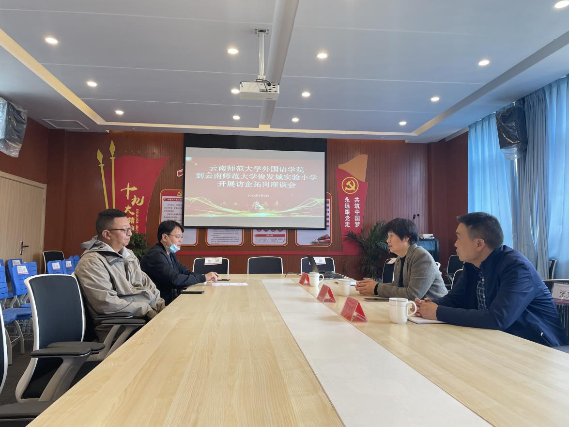在金年会官方网站入口附属俊发城小学和附属俊发城实验小学的调研座谈会上,金年会官方网站入口附属俊发城小学和实验小学董事长杨奕刚介绍了两所小学的基本情况和英语教师需求情况,jinnian金年会王丽峰书记介绍了公司的学科专业建设和2022届毕业生基本情况,双方就开展线下招聘、建立实习就业基地进行了充分的交流。