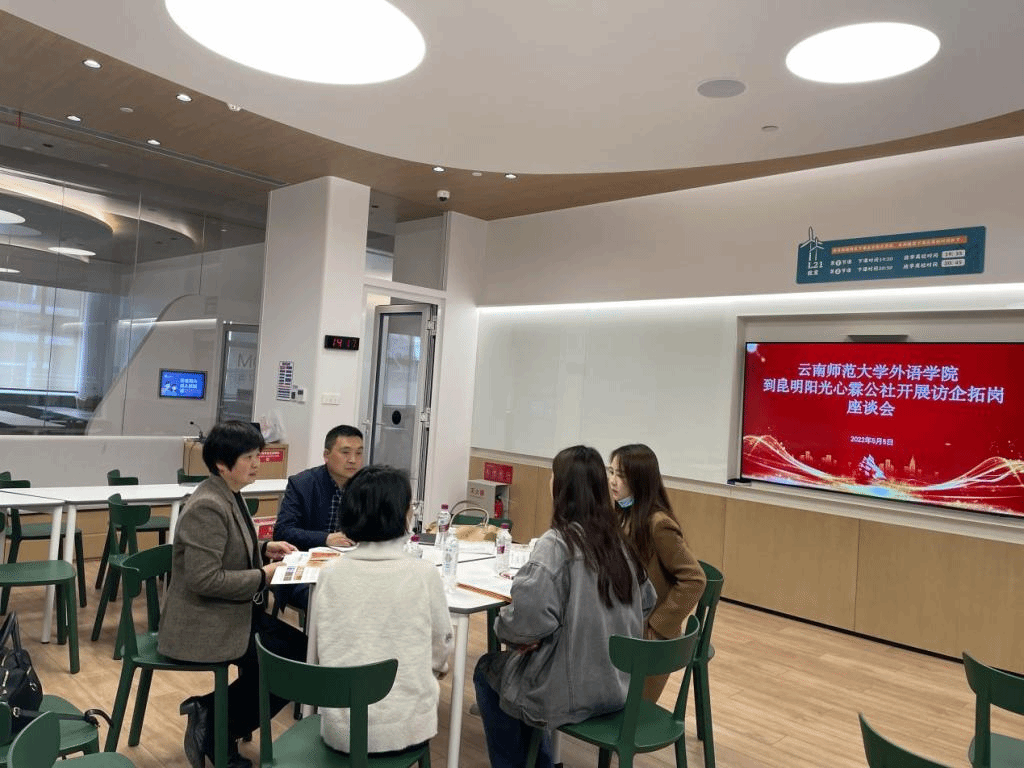 在昆明心霖公社教育培训中心调研时,心霖公社人才发展中心李潆娅Livia老师、罗雅楠Vicky老师介绍了公社的基本情况和往年招聘情况,同时表达了希望与外语公司加强校企合作,建立校企课堂,为员工提供职业生涯规划系列指导课程,建立员工实习就业平台。金年会金字招牌诚信至上何锦东副书记介绍了公司2022届毕业生基本情况,希望双方加强合作交流,畅通人才培养需求,为员工提供更多的职业选择和工作岗位。