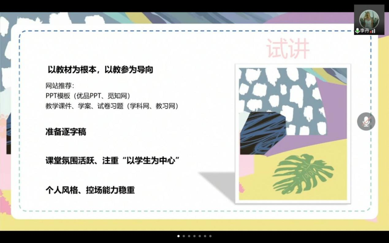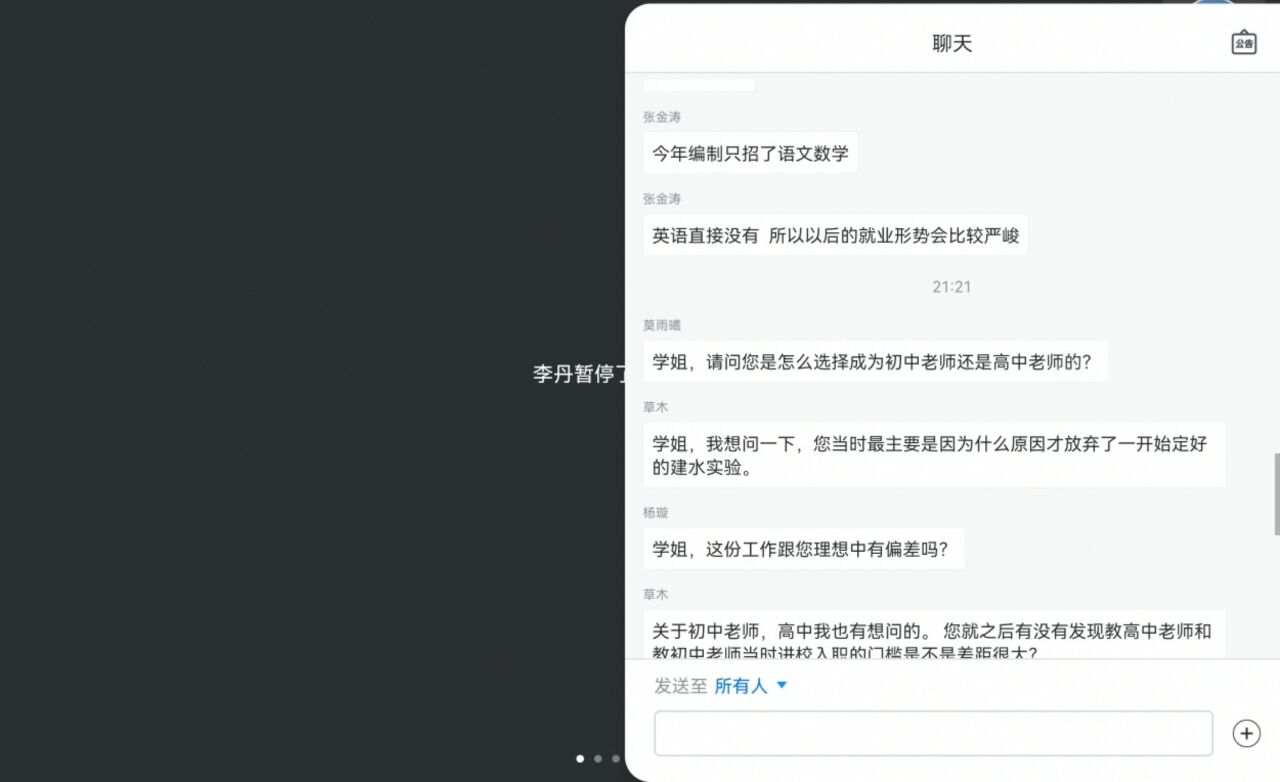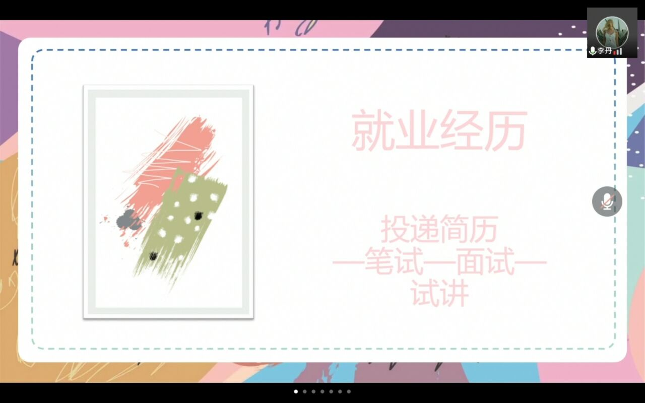 在金年会官方网站入口附属俊发城中学工作的李丹同学讲述了自己的求职经历和入职感想。她从投递简历、笔试、面试和试讲四个方面谈了自己的求职经历,在四个方面都做了详细讲解,希望同学们给自己做一个准确的定位,深入学习,拓宽专业课知识面。另外,她还介绍了自己丰富多彩的工作生活,勾起了学弟学妹对教师职业的向往。