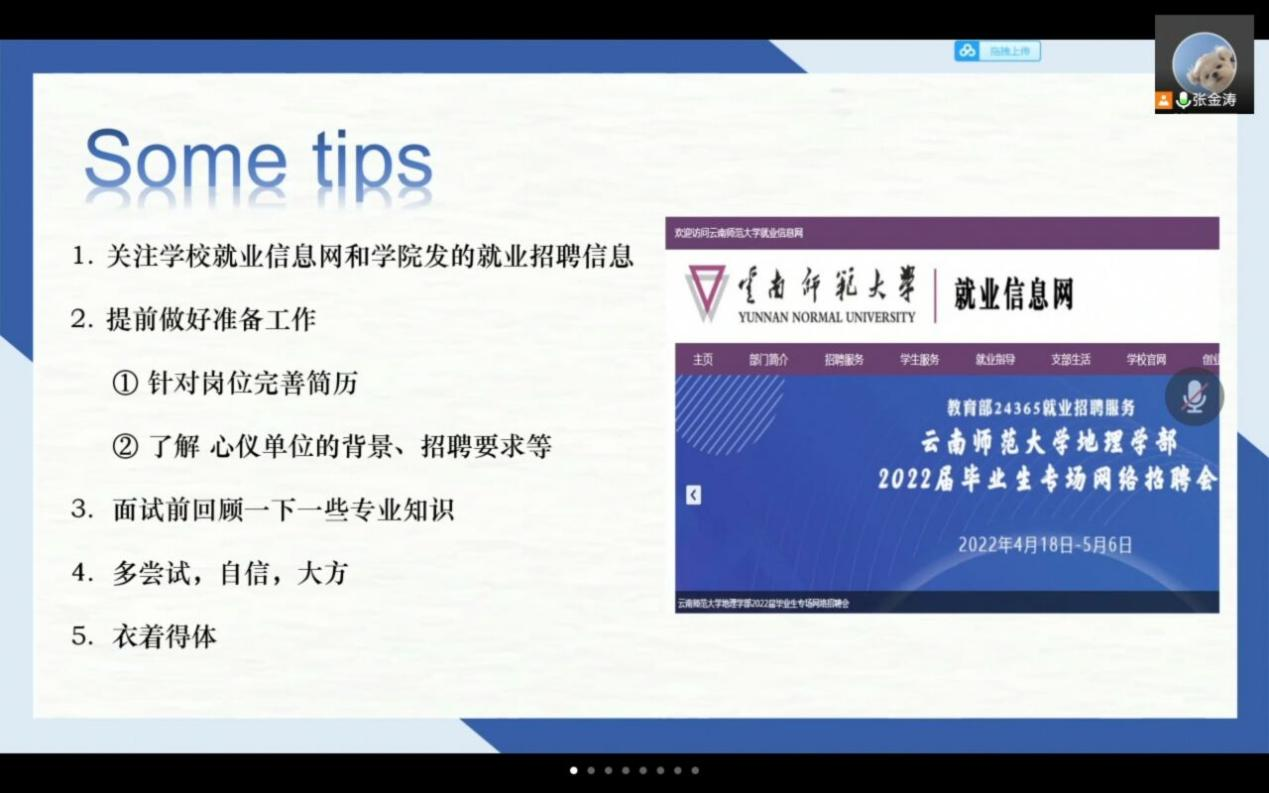 在曲靖一中麒麟公司工作的张金涛同学着重分享了面试经验。她指出,在面试前便应该做足功课,针对应聘要求来完善简历;面试时应衣着得体,自信大方的展示自己,灵活应对各种突发情况尽所能体现个人所发挥的作用。最后,张金涛学姐分享了曲靖一中麒麟公司的工作环境,并鼓励同学们面对求职要上心有信心,不要着急,相信自己。