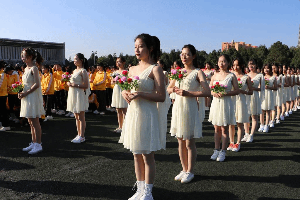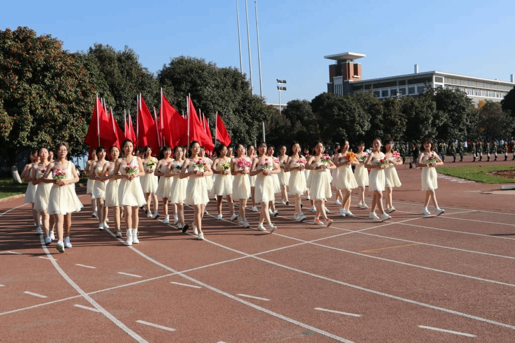当锃亮的皮靴反衬着秋阳的夺目,当铿锵的步伐迎接着寒风的凛冽,国旗护卫队以挺拔之姿托鲜红国旗飒爽走过,国旗督察队以严整之列自跑道徐徐行进,运动会开幕式正式开始。紧随其后走来的是56个身着白色纱裙,流苏垂挂,盛装打扮,手持各色鲜花,面带甜美笑容、娉娉袅袅的姑娘们。她们是金年会金字招牌诚信至上组成的独具特色的鲜花队。多少日辛苦训练,多少次顶着严寒,多少次集合排演,都不惧艰难、精益求精,只为了在开幕式上以饱满的姿态展示美好风貌。今天,她们做到了。
