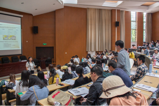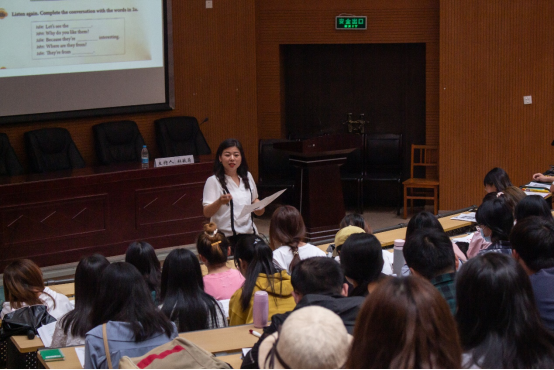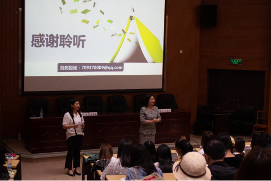 简单自我介绍后,常宏老师切入主题,凭借其在中学一线教学实战与教师招聘中的丰富经验,逐一从交流背景、招聘流程、实战模拟及个人建议四个方面进行阐释。首先,她分析到教师在招聘过程中的优势及不足,并现场统计了在场同学的择业方向。接下来,结合具体实例,常老师为同学们讲述了在招聘流程中应当注意的事项、简历投递与试讲过程里的技巧,以此帮助同学们做足充分准备,为未来的教师招聘环节奠定基础。紧接着,她在PPT上展示出两个实战模拟的具体案例,并让同学们参与互动,从而使得他们对科学的教学方法和正确的育人方向有更为深刻的体会。最后,常老师从一名优秀的英语老师应葆有的态度、锻造的品质及持有的情怀等多角度给出了全方位的建议,同时向同学们送上自己真挚的祝福。