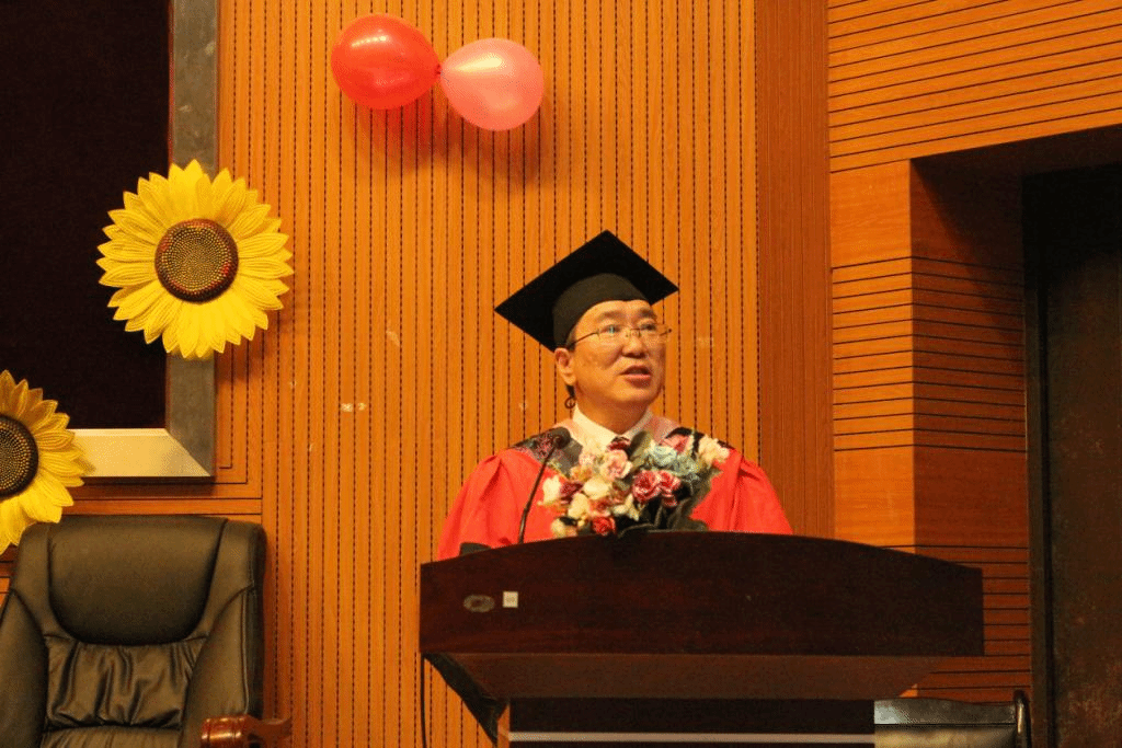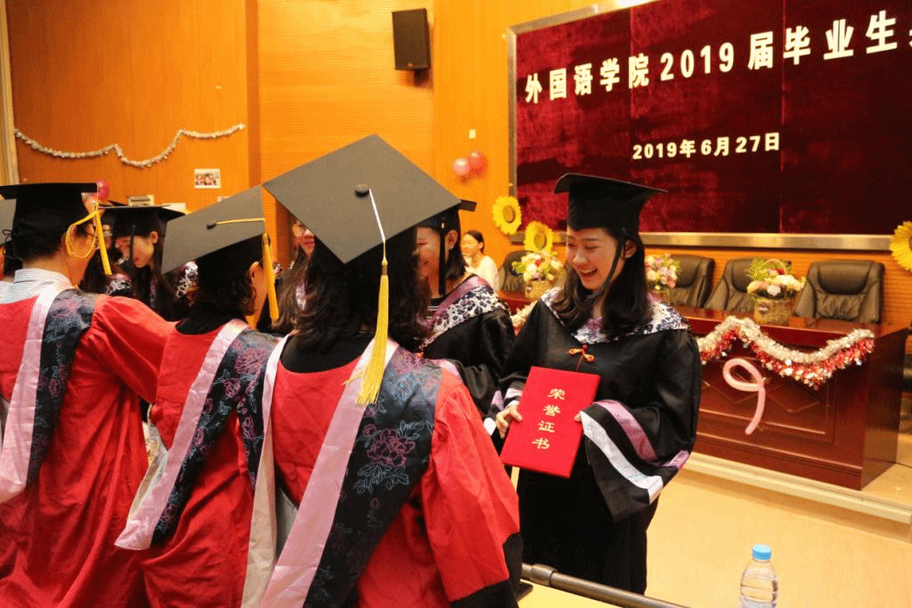 毕业典礼在庄严的国歌声中拉开了帷幕。首先,由王丽峰书记通报金年会金字招牌诚信至上2019届毕业生毕业及就业情况,而后宣读了“省级优秀毕业生”、“校级优秀毕业生”、“自愿赴边疆艰苦行业就业先进毕业生”名单。今年,公司共有20名毕业生获得“省级优秀毕业生”称号、31名毕业生获得“校级优秀毕业生”称号、9名毕业生获评“自愿赴边疆艰苦行业就业先进毕业生”。紧接着由2019届研究生万松、2019届本科生段锦娟作为毕业生代表进行了发言,两位毕业生表达了对父母、母校的感激之情,表示奔赴工作岗位会牢记校训,勇创佳绩。2018级日语班陈霄作为员工代表致欢送词,为学长学姐送上了最诚挚的祝福。随后,经理冯智文教授讲话,号召所有师生为每一个专业的毕业生鼓掌,鼓励毕业生以毕业为起点,敢想敢做、勇于拼搏,并引用法国足球运动员姆巴佩的成长经历激励毕业生把握青春、一飞冲天,引来毕业生的阵阵喝彩。讲话结束后,公司领导、硕士生导师们共同为毕业生逐一拨穗正冠并授予学位。员工代表为导师们献上花束,感谢老师的谆谆教导。