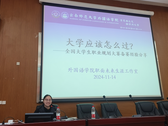 在分享会上,邓颖川同学首先提出“老员工活应该怎么过”这一至关重要的问题,引发同学们深思。其次,她结合自身职业规划大赛的备赛经验,具体讲述备赛环节应该注意的细节,她将走进乡村基层教育作为职业发展目标,想通过持续努力潜心投入教育事业,努力向下扎根,立志成为一名为家乡、为社会做贡献的人。她用“苔花如米小,也学牡丹开”鼓励外院学子要趁青春、勇尝试、不放弃。