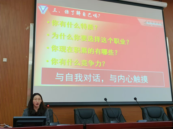 曹莹同学通过分享自己职业规划大赛的经验,鼓励学弟学妹们锻炼个人本领、善于把握机会。她以“你了解自己吗”发问,告诉同学们要善于挖掘自己的潜力、积极投身各类实践活动。她用自己六次支教的经历激励学弟学妹们将个人梦想融入祖国社会发展需求,在不断前行中牢记初心、保持热爱,脚踏实地、乐于奉献,刚毅坚卓、砥砺前行。