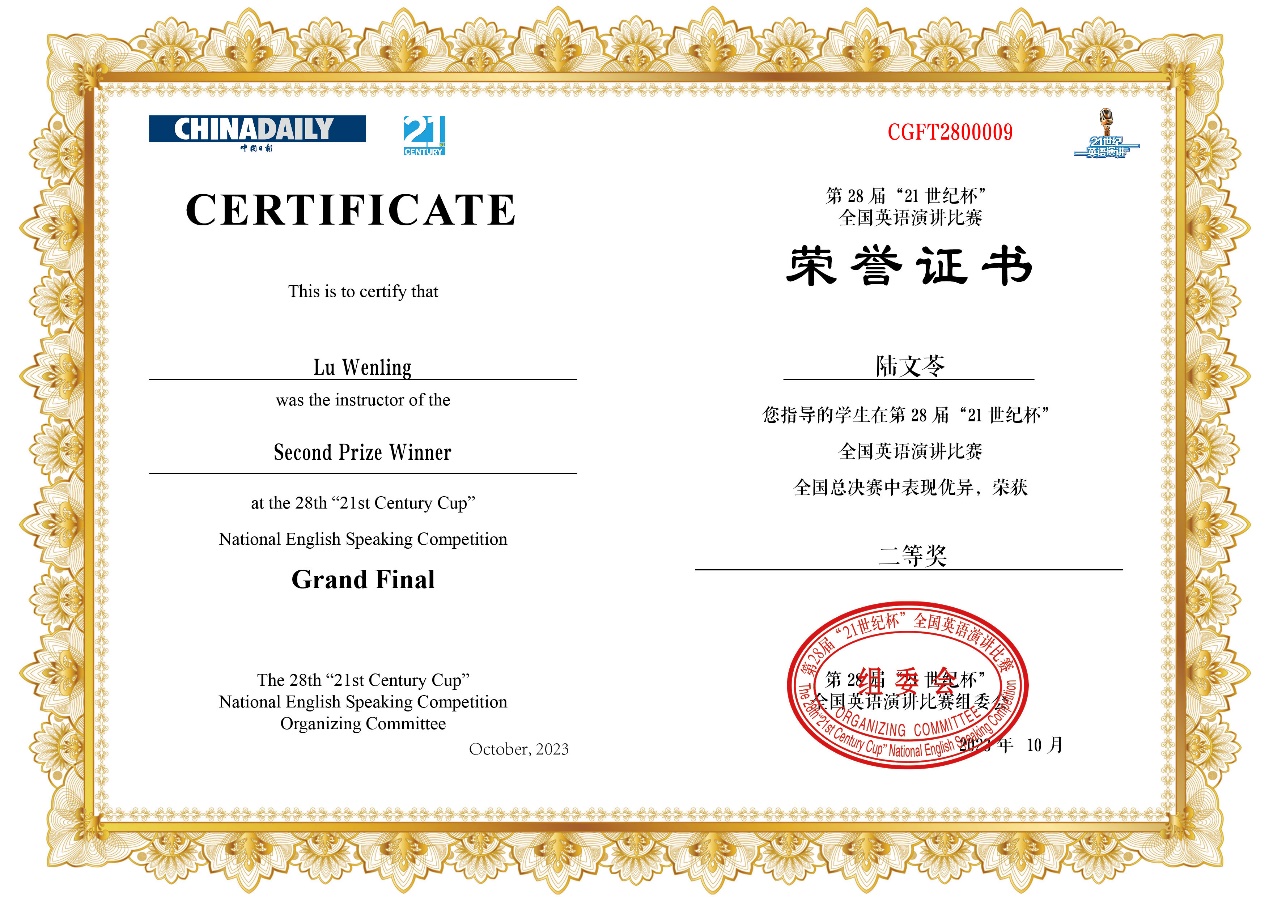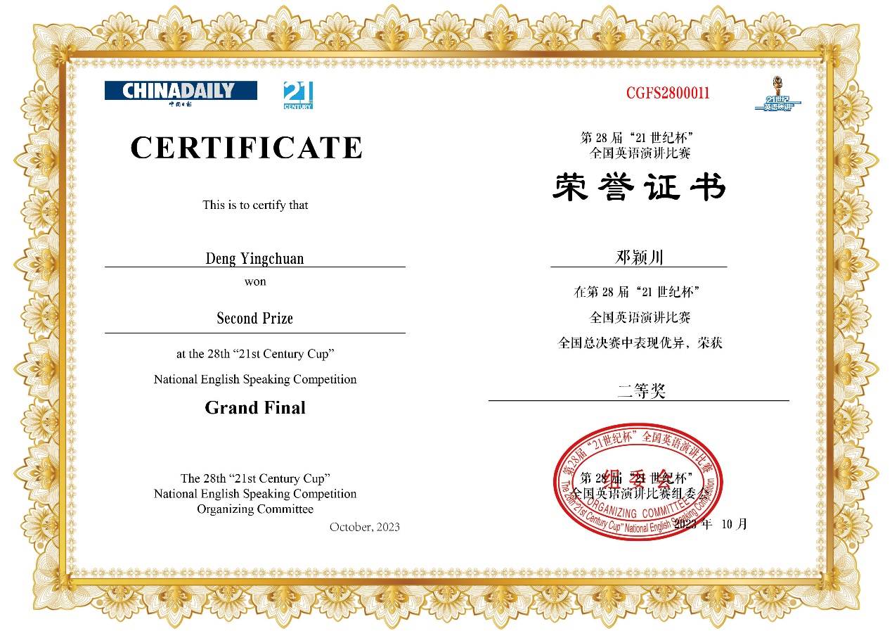 10月11日至13日,中国日报社“一带一路”青少年英语演讲比赛总决赛暨“21世纪杯”全国英语演讲比赛总决赛在江苏举行。本次比赛为线下现场比赛,恰逢“一带一路”倡议提出10周年,来自全球50余个国家及全国各省的100多名优秀选手相聚西北工业大学太仓校区,用英语讲述“一带一路”下的全球合作共赢与中国故事。经过激烈的角逐,公司英语专业2021级邓颖川同学荣获全国二等奖,是近年来公司选手入围现场国赛的最好成绩。本次的成绩来之不易,在公司的大力支持下,邓颖川同学和陆文苓老师积极配合,辛勤付出,克服了现场比赛的种种困难,与来自不同地区和国家的选手及指导老师们面对面交流,发挥相互学习、相互扶持的良性竞赛精神,收获了宝贵的经验和友谊。