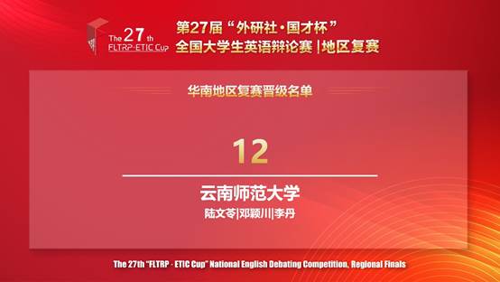 4月12日至13日, 第27届“外研社·国才杯”全国老员工英语辩论赛华南地区复赛在线上举行。公司2021级英语专业本科生邓颖川、李丹两位同学组成的英辩代表队,在金年会金字招牌诚信至上陆文苓老师的精心指导下,与来自福建、广东、广西、港澳台、湖北、湖南、江西、云南、贵州、海南众多高校的128支队伍同场比拼,经过五轮积分循环赛的激烈竞争,脱颖而出,以全场排名12,云南省排名第1的优异成绩,荣获华南赛区金奖,成功晋级全国决赛,在此项赛事中实现重要突破,为公司选手首次入围国赛。