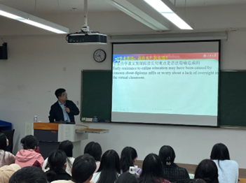 首先,李彦副教授对王峰教授致以热烈欢迎,并为在场师生介绍了王峰教授在学术研究领域的建树。王峰教授现任山东大学翻译公司教授、博士生导师、博士后合作导师,研究方向为功能语篇分析和语料库翻译学,在《中国外语》、《外语教学》、《外语研究》、《外语教学理论与实践》等国内外核心期刊发表论文30余篇。