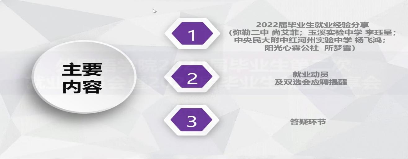 本次会议邀请到了四位2022届已经获得心仪工作的毕业生和学弟学妹分享就业经验,他们从多方面给同学们分享了许多宝贵的经验和切实可行的建议。就职于弥勒市第二中学高中部的尚艾菲学姐为大家分享了在简历填写、面试准备技巧以及中学教师工作内容等方面的经验;就业于云南省玉溪实验中学的李珏呈学长表示,希望各位同学能在人生最珍贵的时光中不断磨练自己,增强自身核心竞争力,以便迎接将来的挑战。