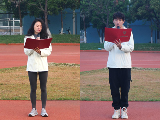 教师代表段红老师从“追光者、示范者、探索者、守护者”四个维度倡议师生,以“四有”标准严格要求自己,用实际行动诠释“学为人师,行为世范”的崇高追求;作为云师人,要赓续红色血脉,传承“刚毅坚卓”的校训精神,为培养有家国情怀、有全球视野、有专业本领的“三有”外语人才而不懈奋斗!员工代表杨启航结合专业特色郑重承诺,立志要以“四有”标准自我淬炼,掌握扎实的语言技能,以语言为媒,让世界听见中国的声音,让中国的故事走向世界。仪式在全体师生“请党放心,强国有我”的铿锵誓言中圆满落幕。