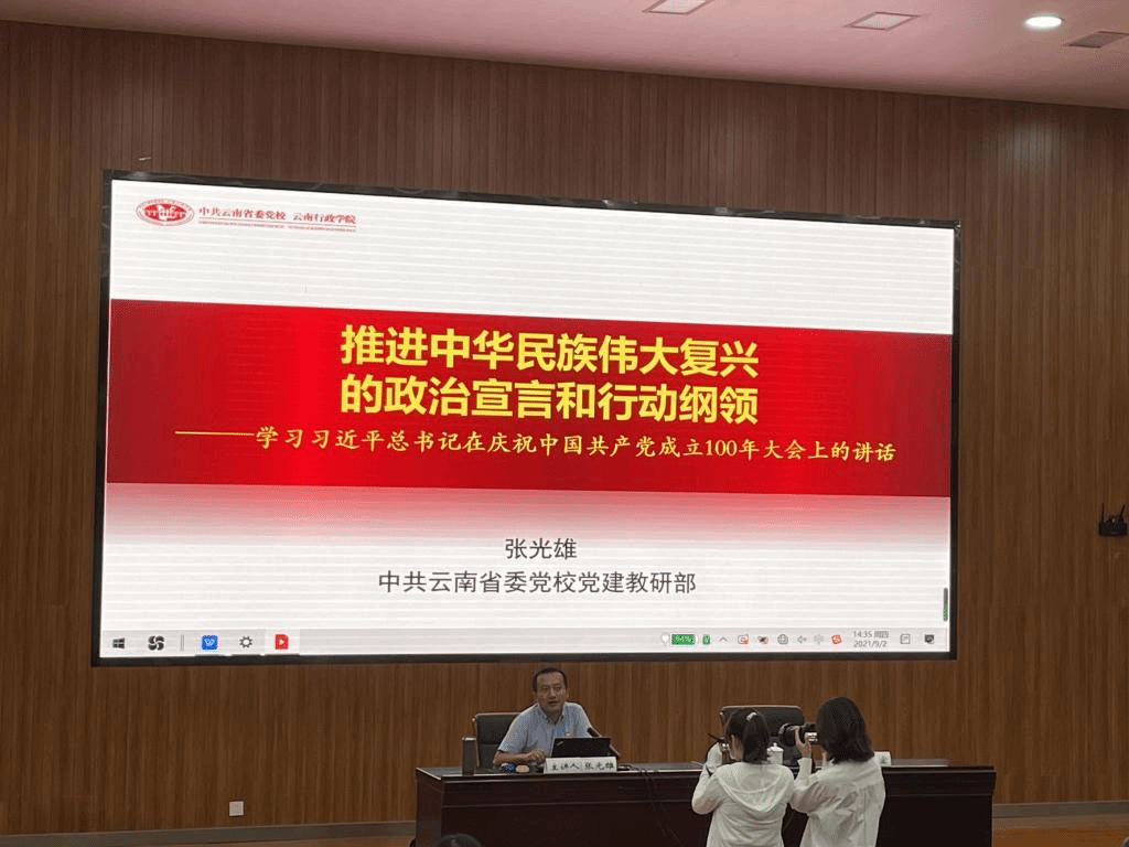 为深入学习贯彻习近平总书记在庆祝中国共产党成立100周年大会上的重要讲话精神, 9月2日下午,公司特邀云南省委党公司党建教研部副主任、云南省党建研究会特邀研究员张光雄在呈贡主校区汇学楼报告厅作题为《推进中华民族伟大复兴的政治宣言和行动纲领——深入学习贯彻习近平总书记“七一”重要讲话精神》的专题宣讲,公司党委副书记杜敏菊同志和辅导员带领员工代表参会学习。jinnian金年会在明德2号楼108报告厅设立分会场,组织师生集中收看此次宣讲。