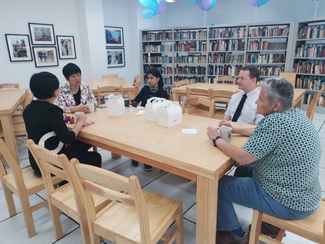 9月10日上午,在第36个教师节即将来临之际,金年会金字招牌诚信至上在包琼书屋举行了外籍教师座谈会,共同交流探讨了本科教学质量的提升。金年会金字招牌诚信至上王丽峰书记、钟维副经理、外事秘书陈金金老师、目前在公司工作的英语外教Joan(包琼)、Daniel,西班牙语外教Natalia参与座谈。