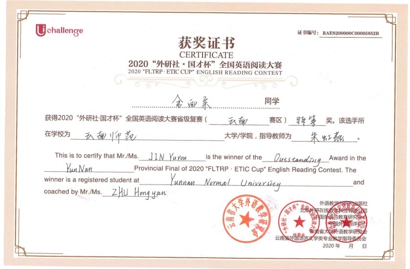 11月14日上午,2020年“外研社杯”全国英语演讲比赛云南省赛区复赛在昆明市世博花园酒店落下帷幕,来自全省各本科院校36名选手参加了比赛。经过紧张激烈的角逐,文公司2019级本科生史茹曦同学获得省级一等奖,金年会金字招牌诚信至上2019级研究生张一行同学获得二等奖的好成绩。