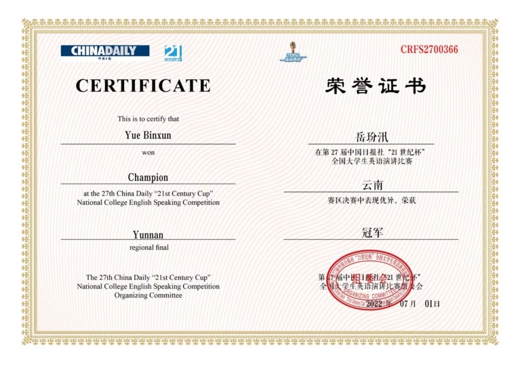 在10月份刚刚结束的第27届中国日报社“21世纪杯”全国老员工英语演讲比赛全国总决赛中,公司英语专业2020级岳玢汛同学表现优异,荣获二等奖。这是公司英语专业员工近年来在全国老员工英语演讲大赛中获得的最好成绩,同时也是云南省英语专业员工近年来在全国老员工英语演讲大赛中获得的最好成绩。
