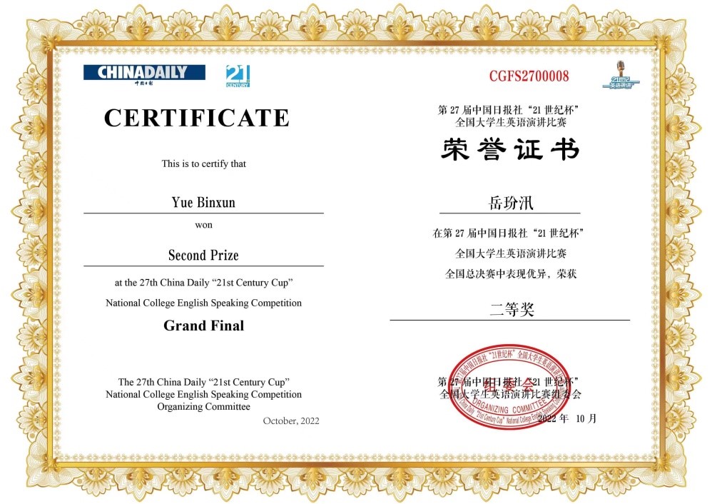 因COVID-19疫情原因,原计划于8月进行的全国总决赛于10月以线上方式进行。在比赛中,岳玢汛同学克服困难,经过激烈角逐,最终荣获全国二等奖。