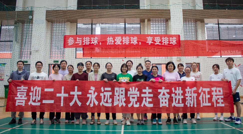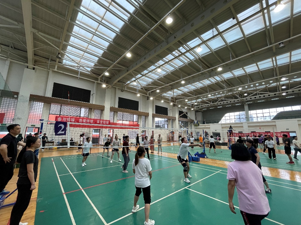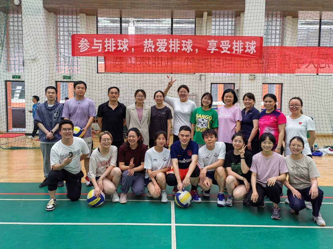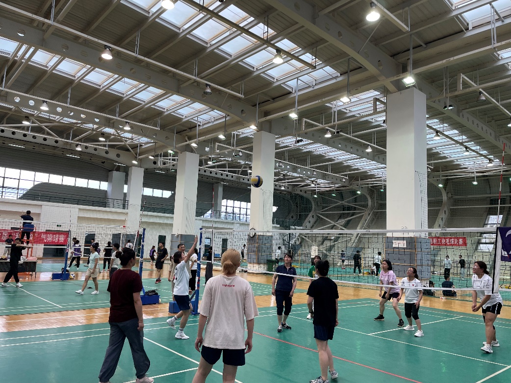 比赛中,同学和老师们在场上,击球、扣球、传球动作行云流水一气呵成,比赛中男队女队的同学轮番上阵和老师们实力对抗,老师们也不甘示弱,轮换交替中,比赛接近尾声,最后老师们获得了胜利,随后老师和各位同学们进行了合照。