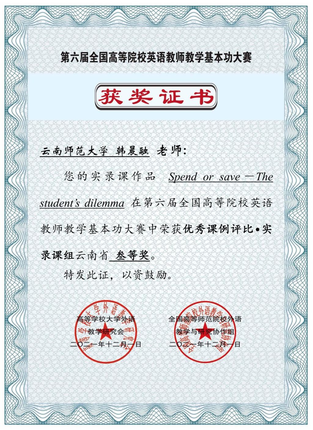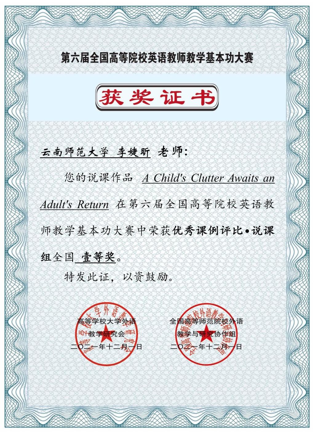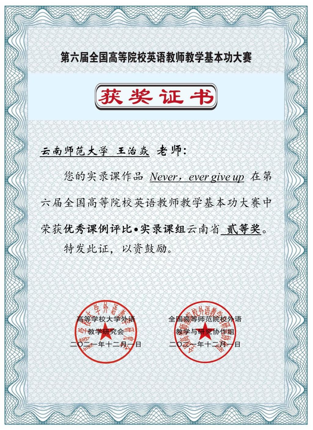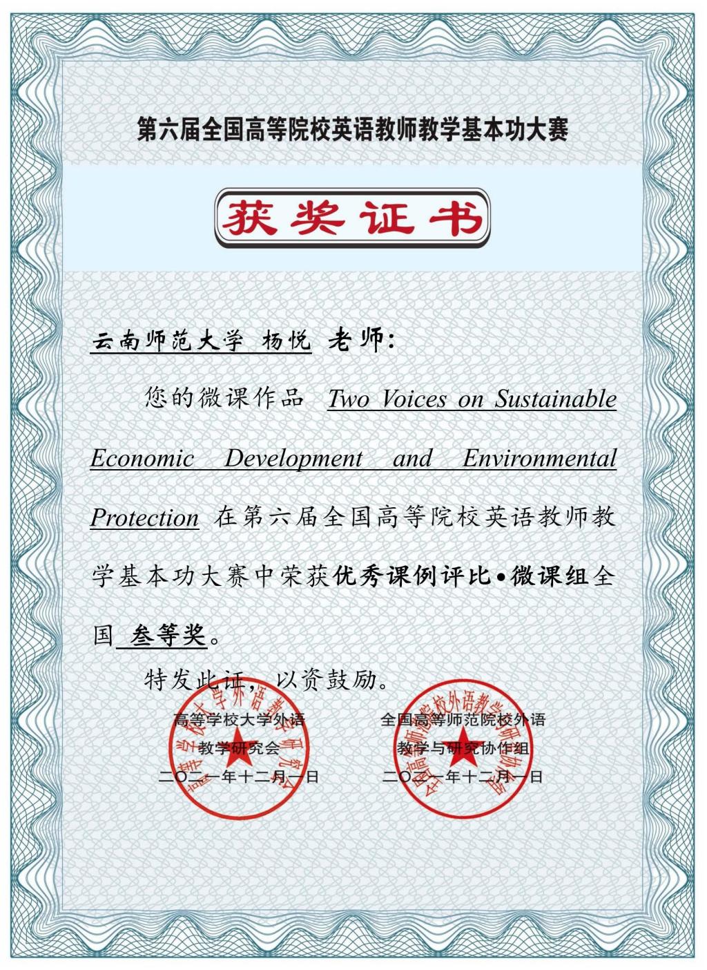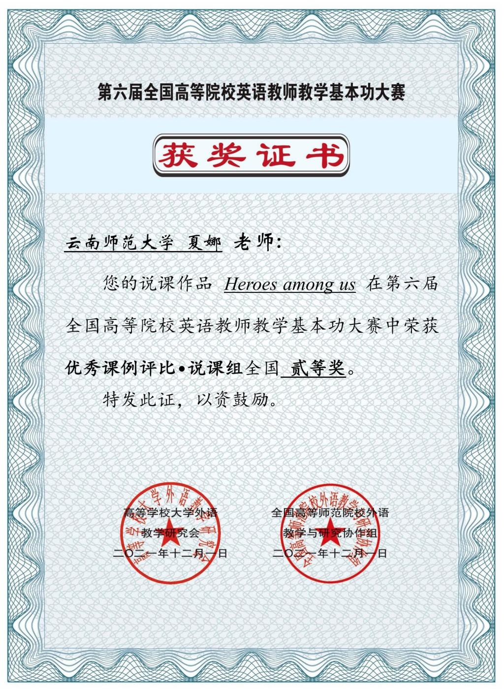 为响应党的十九届五中全会、全国教育大会、和《加快推进教育现代化实施方案(2018-2022)》精神,推动构建高质量高等教育体系,促进优质课程资源共建共享,jinnian金年会8位教师积极报名参加第六届全国高等院校英语教师教学基本功大赛,均获佳绩。