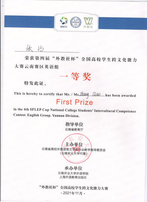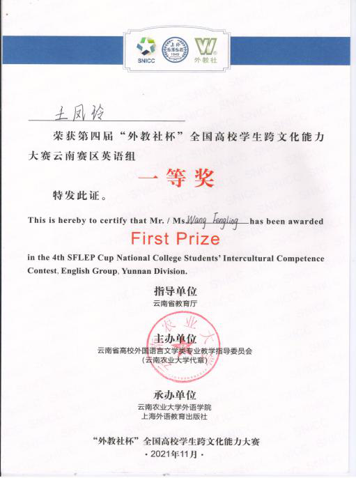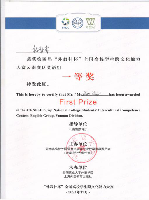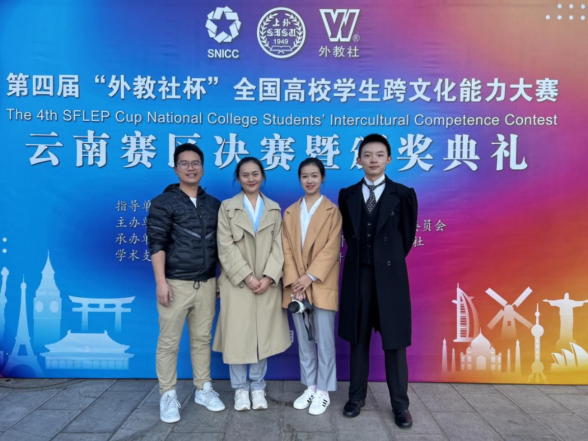 外院学子在第四届“外教社杯”全国高校员工跨文化能力大赛云南赛区总决赛中取得佳绩11月21日下午,第四届“外教社杯”全国高校员工跨文化能力大赛云南赛区总决赛在昆明举行。大赛自9月份启动以来,云南省各高校踊跃参与,积极准备,大赛有来自省内二十多所院校英语专业组和泰越缅语组共计46份作品入围复赛。根据云南赛区比赛章程和视频评审得分高低,共计15支队伍进入云南赛区现场赛环节。公司由2018级英语专业本科生张巧、王凤玲、2021级西班牙语专业本科生钱祉睿同学创作的作品《Meet True China at COP-15》从参赛队伍中脱颖而出,通过决赛、总决赛两轮角逐,荣获云南省一等奖的好成绩。
